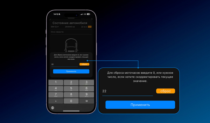 На экране расширенного состояния автомобиля отображена исчерпывающая информация о давлении в шинах, пробеге, положению стекол, уровне омывающей жидкости. Кроме того, теперь Pandora максимально грамотно считает моточасы, которые вы можете сбросить или изменить самостоятельно, например, при замене масла. Моточасы считаются только тогда, когда двигатель работает, что особенно важно для гибридов.