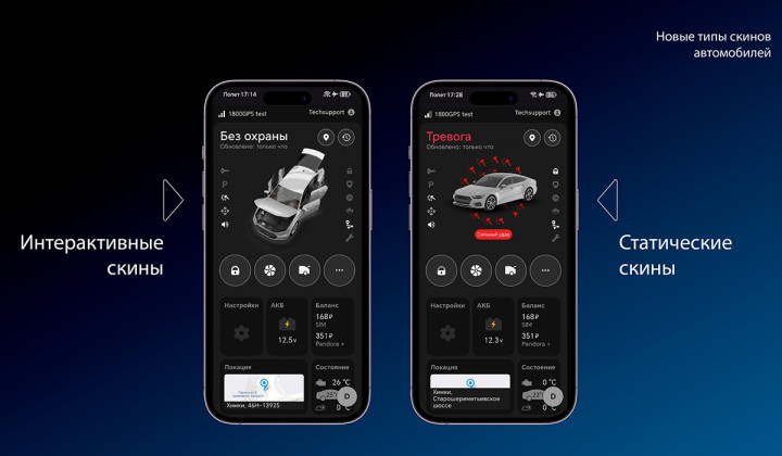 По многочисленным просьбам пользователей разработчики добавили массу скинов моделей автомобилей. В дополнение к кастомным интерактивным 3D-скинам теперь добавлены статические скины автомобилей с упрощенным отображением информации о статусах выполнения команд и тревожных событиях.